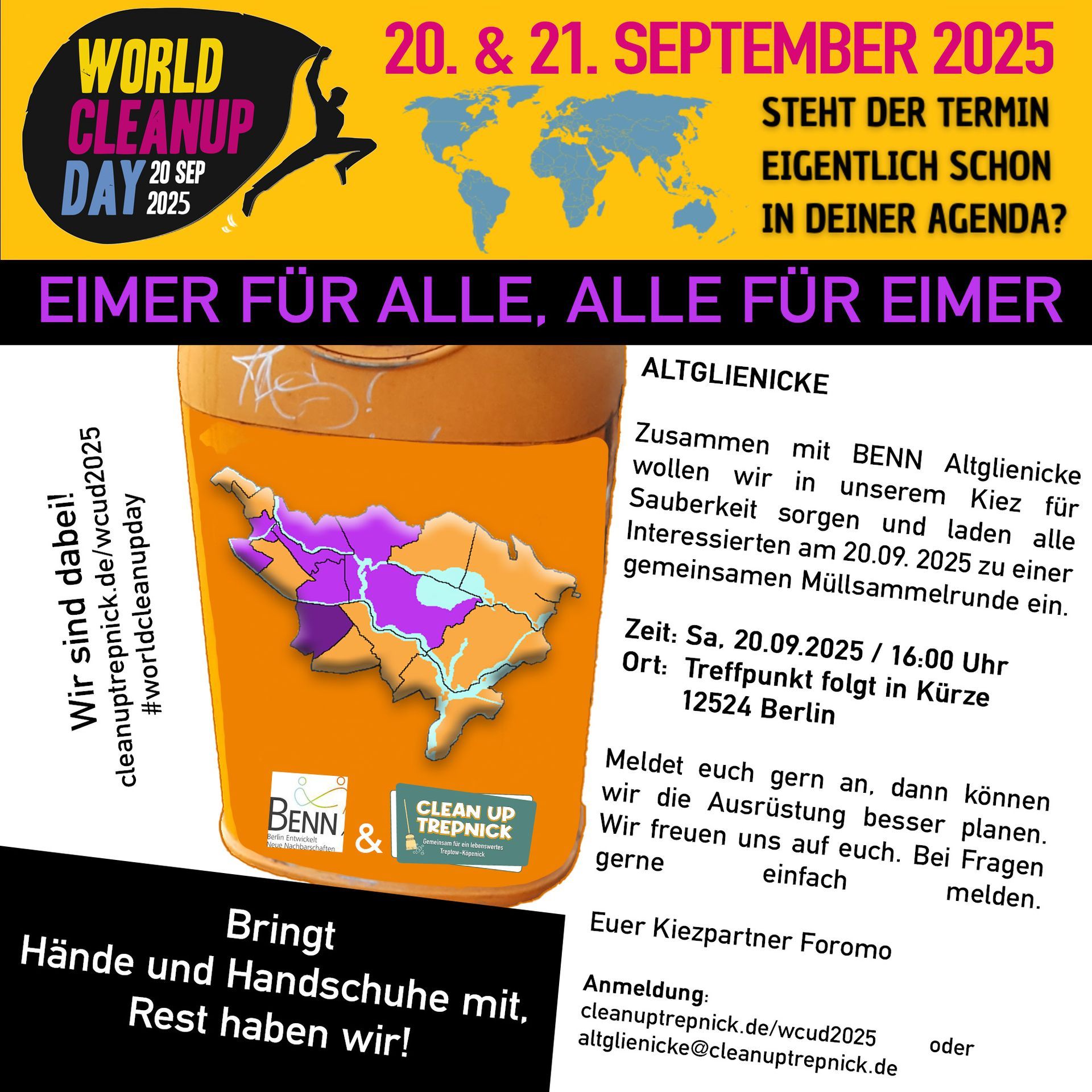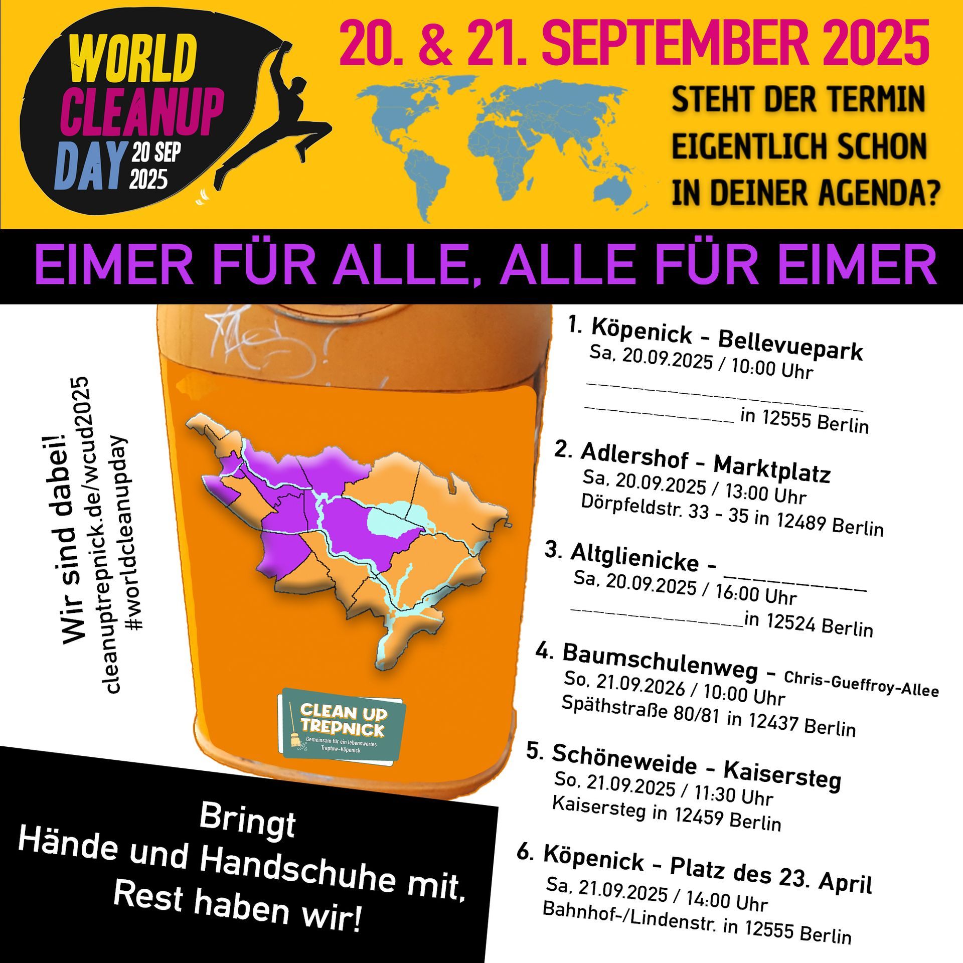 Nachstehend bereits die ersten Anhaltspunkte für die Müllsammelaktionen unserer Kiezpartner in Treptow-Köpenick. Es sind noch nicht alle Details geklärt, das geschieht jedoch im Laufe der kommenden Wochen. Weiter unten könnt ihr euch dann für eure Wunschaktion(en) anmelden. Das hilft uns bei der Planung und Vorhaltung von ausreichend Sammelmaterial.